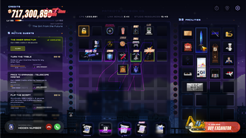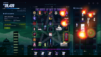 The grid represents your game studio, split into tiles on a 2D plane. Grow your office space by completing missions, find rare facilities to place on your grid, and increase their level and output. Placing certain facilities together activates unique buffs, abilities, and output multipliers that benefit your run, letting you reach greater levels and unlock new progression.