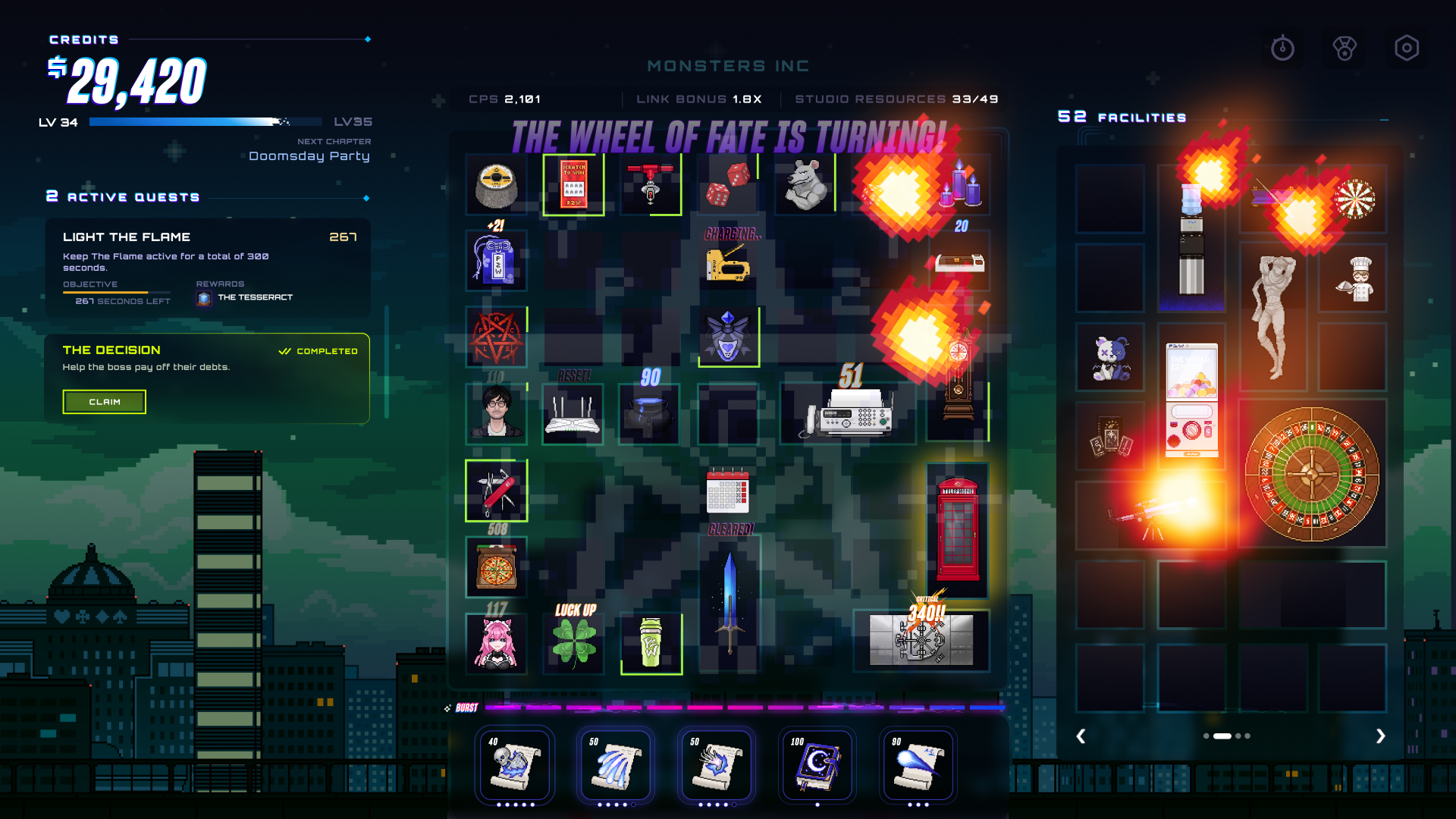 Over 100 unique facilities to pick from! Every playthrough has randomized rewards ranging in rarity from Common to Legendary. Each selectable facility has unique and handcrafted pixel art with a retro vibe, complete with unique animations sure to keep you wondering what's next!